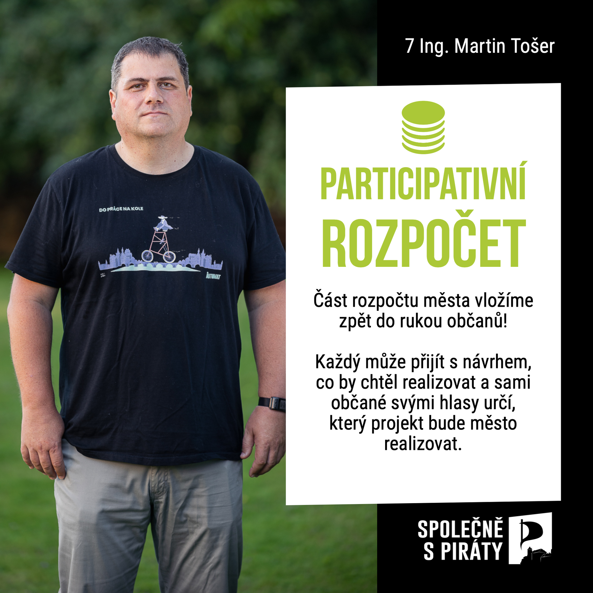 V rámci mého 30ti letého působení v Armádě ČR jsem působil v zahraničních misích, na velitelství NATO i v různých posádkách v rámci ČR a všude jsem si mnohokrát ověřil, že města, ve kterých jsou do řízení zapojeni samotní občané, mají úplně jiný první pohled. A tím jsou usměvaví lidé. A proto se budu snažit o možnost, aby naše město bylo více řízeno občany a méně politiky. Pojďme do toho SPOLEČNĚ.
