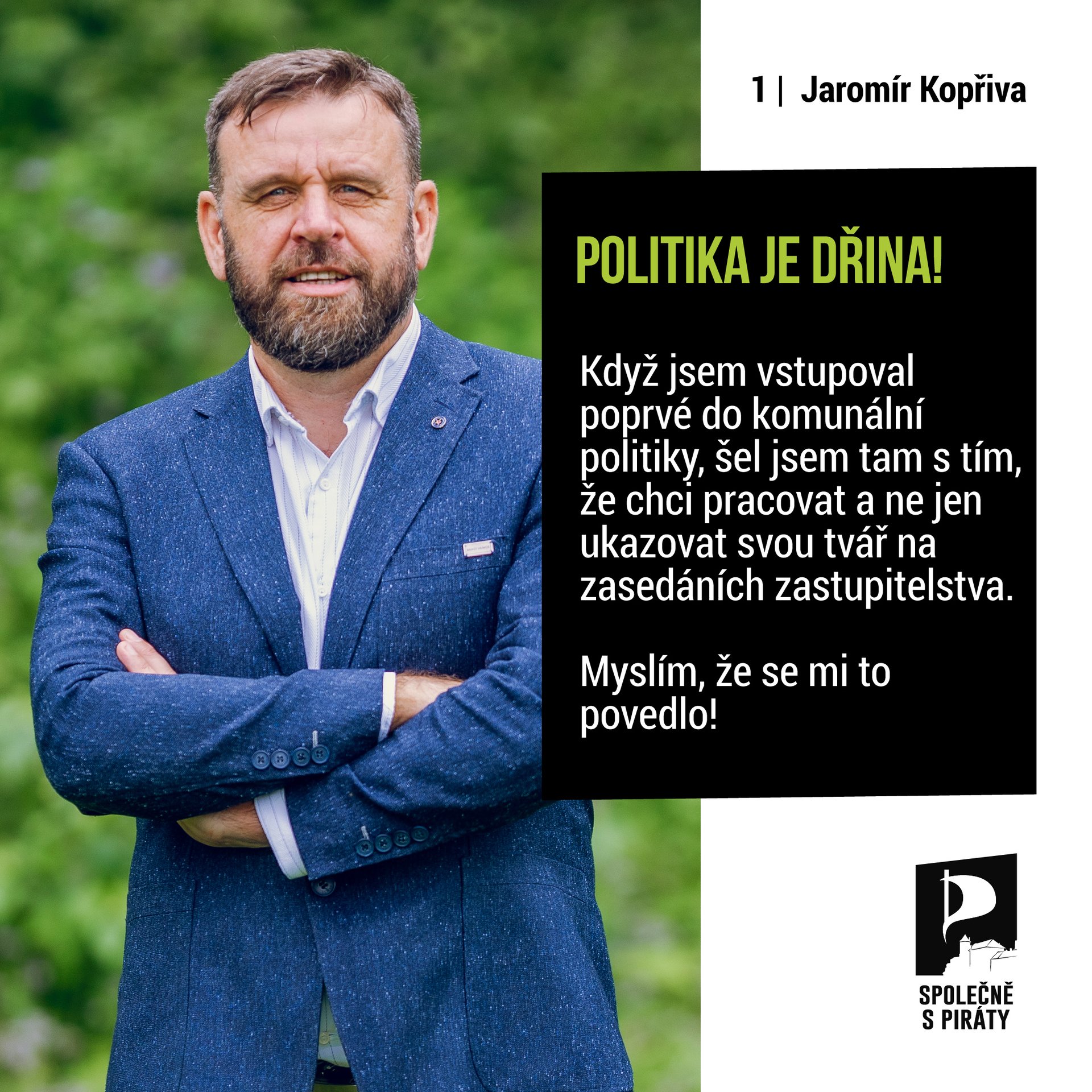 Jmenuji se Jaromír Kopřiva. Je mi 54 let a již 30 let pracuji jako anesteziolog v jindřichohradecké nemocnici. Chtěl bych vám zde vyvrátit slovní spojení „fenomén doktor“, které tak rádi používají naši konkurenti. Když jsem před čtyřmi lety vstupoval do politiky, tak jsem tam šel s tím, že chci pracovat a ne jen ukazovat svou tvář na zasedáních zastupitelstva. Myslím, že se mi to povedlo. První dva roky jsem působil jako zastupitel a předseda sportovní komise. Zde jsem úspěšně prosazoval nastavení transparentních podmínek pro rozdělování dotací. Další dva roky jsem pracoval ve funkci radního, což obnáší týden co týden projednat desítky materiálů. Toto období bylo opravdu časově velmi náročné a zvládnout šlo především díky velké podpoře a toleranci mých kolegů v nemocnici. Má účast na všech zasedáních rady, zastupitelstva a komise byla i díky tomu 100%. Pokud budu mít opět možnost pracovat v orgánech města, budu podporovat transparentní jmenovité hlasování i v Radě města. Rozhodnutí rady je prezentované tak, že občané mohou nabýt dojmu, že jde o rozhodnutí všech radních. Já se se spoustou rozhodnutí neztotožňuji. Respektuji však demokracii!